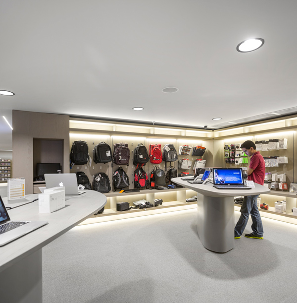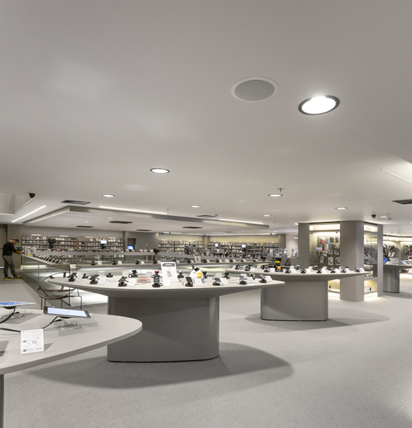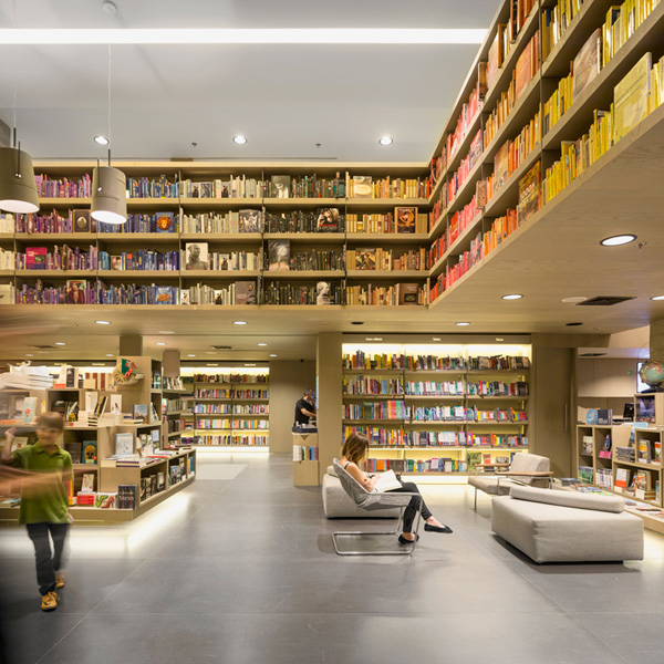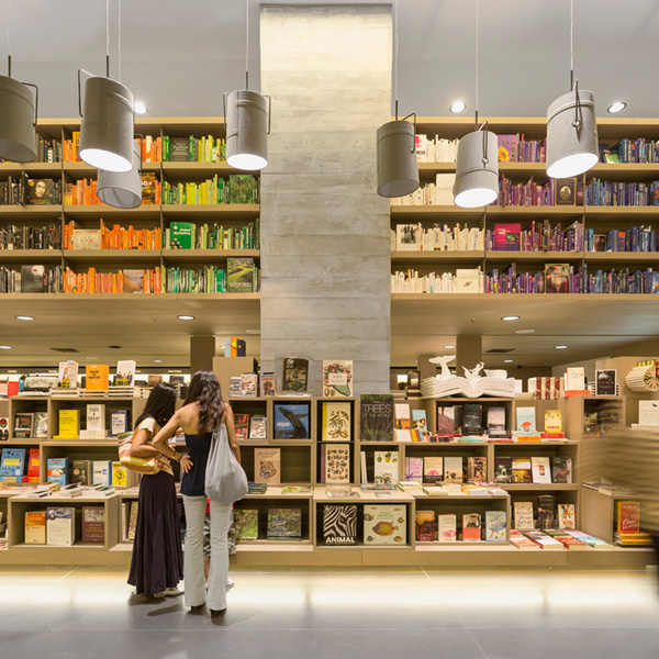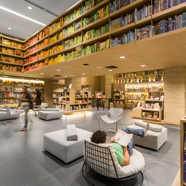 坐落在人来人往的购物中心里,Saraiva 自然融合了书店和休闲广场两种属性。因为面积宽敞,除了很多大型书架之外,还有产品体验区、咖啡区、儿童阅读区等,负责设计的 ARTHUR CASAS 工作室定制了烟灰色的陶瓷瓷砖、使用原木色的货架,打造出温柔平静的店内环境。不仅让书籍得以充分展示(封面颜色相似的书放在一起,视觉效果真的很惊艳),顾客也能在这里轻松悠闲地浏览、阅读。