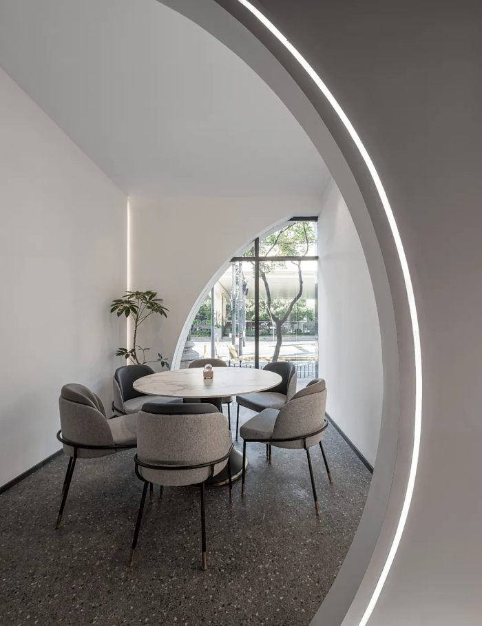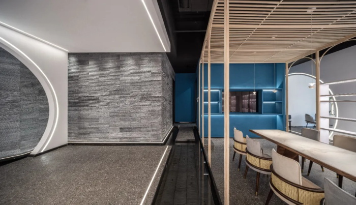 建筑内的墙体被粉刷为白色和蓝色为基调,一根根百叶立柱以其双曲线型圆拱顶造型支撑着极简主义风格,“空间是设计师寄托灵魂的情感表达,我希望通过灯光与材质的现代表达,传达出设计的精神。”