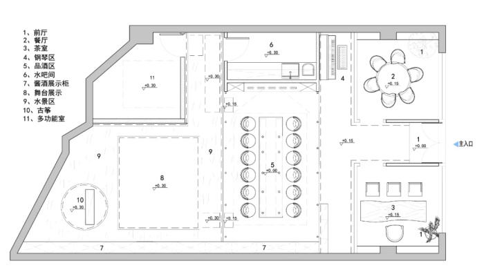 大面积的砖面与蓝色对比是设计的亮点,空间置入了一片水景,与舞台相融合得到最大化感受体验,带来亦真亦假的虚幻感,打破和颠覆以往传统酱酒品牌空间的气质,成为当代主流品牌核心价值。