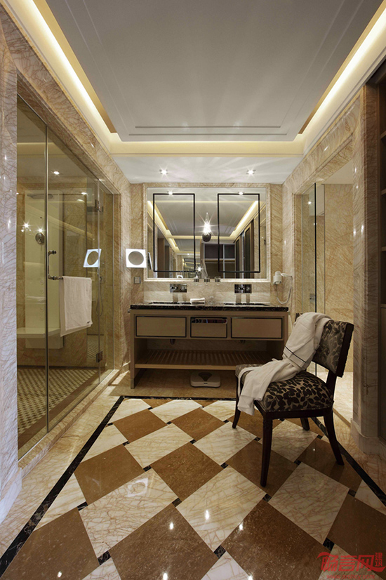 使用材料:金丝白玉大理石,贝壳面马赛克,皮革,金影木,墙纸