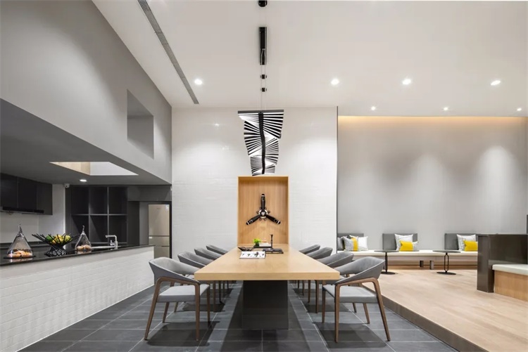 灰、黄、白的大众家居配色,让空间流露出家的熟悉,波浪吊灯点亮后犹如空中云朵,营造漫步云端的空间感,螺旋桨模型让空间成为大型的机舱。在和谐温馨的氛围中行进,交流也变得顺畅自然。