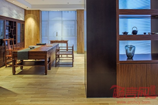 本案是一家投资公司,作为高层领导办公及VIP客户接待为主的场所,设计师林开新通过现代与传统的碰撞,从矛盾中找和谐,以简约手法诠释东方文化,营造一个“文化性”与“当代性”和谐并存的室内空间,营造天人合一的意境。