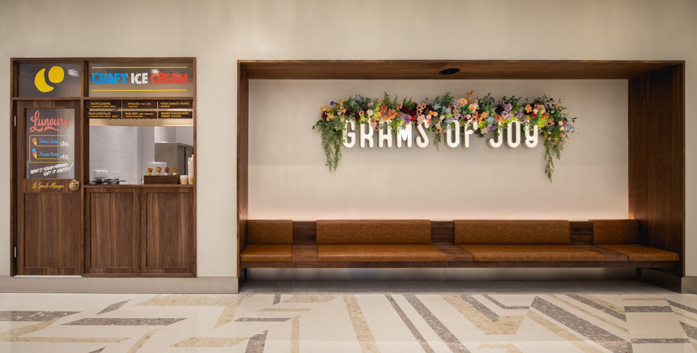 进入餐厅中心区域之前,客人会经过一处内嵌座位区和一个冰淇淋窗口。明亮的手绘标牌向传统风格致敬,同时为空间增添色彩和俏皮感。