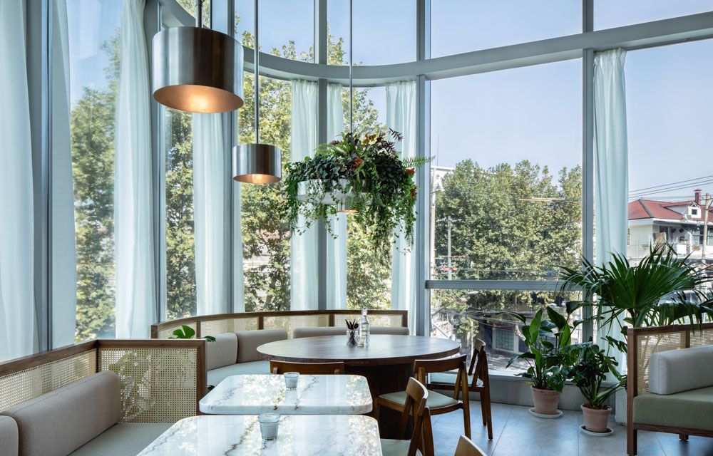 餐厅位于商场拐角处,有全高的落地窗和超高天花板。设计充分利用空间现有的开放性,让窗外的景观在室内延伸。胡桃木色的藤条沙发围绕窗户摆放,将客人包裹在由绿植隔档的私密空间中。对侧的柜台区域是落地木架,架子上陈列着精心挑选的法国美食和收藏品。