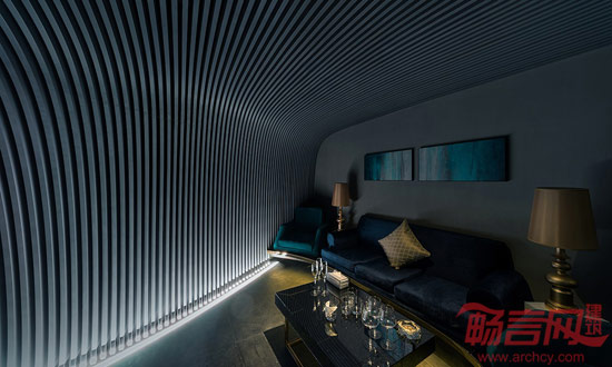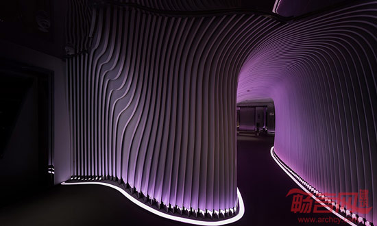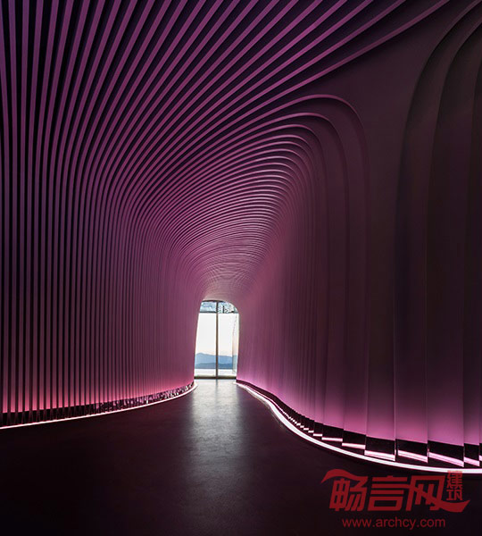 公共走道的曲线设计与湖水相映成彰,让穿行者仿佛置身一股涌动的水流之中,黑色石材的片墙中灯光色彩变换,像西湖倒影中的霓虹,唯美绚烂。通过巧妙的设计,原有室内的功能被大大增加,可进行多元化的活动。