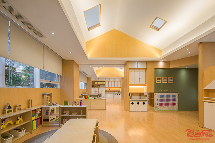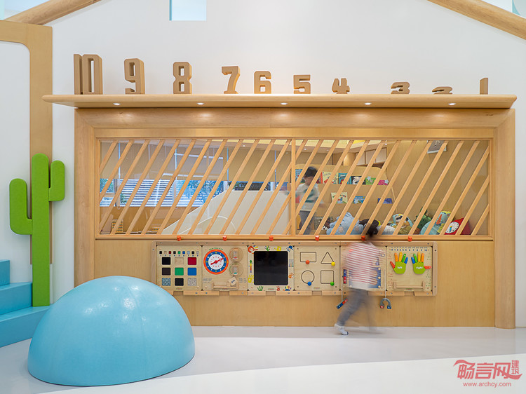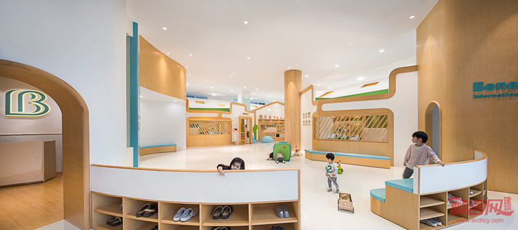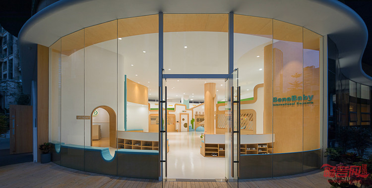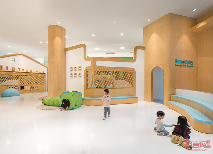 BeneBaby国际日托,是一间为新时代的父母提供专业的美式日托服务,致力于培养2-4岁儿童的行为习惯,独立人格及社交能力的专业教育机构,位置坐落于深圳后海片区,周围是高端住宅及写字楼,定位为高端幼儿早期教育机构,其外立面及内部环境由VMDPE圆道设计公司设计。BeneBaby整体环境不仅迎合了教学环境的各种需求,还以一系列开放和灵活的空间规划营造出舒适的梦想小镇式成长空间,为学龄前儿童构筑了逐渐适应陌生环境的条件,用无微不至的关怀、柔软舒适的细节以及充满趣味和无限幻想的室内设计,结合高品质多功能的空间,完美诠释了设计师理念。