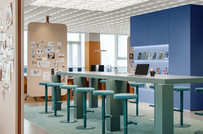 这种双重性还体现在材料和颜色的选择上。材料处理保留天然纹理,并与科技美感相辅相成;色彩方案则将充满活力和朝气的色调与沉稳的色调结合,相得益彰。对比产生的张力营造出一种鼓舞人心的氛围,为新想法、互动和集中办公创造空间。