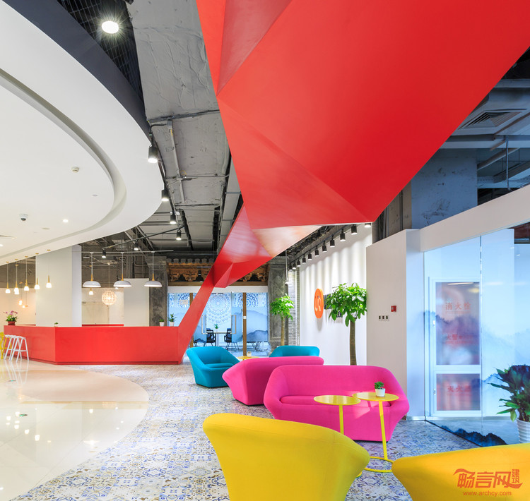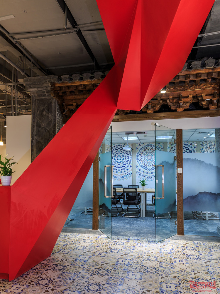 空间设计着重塑造清新淡雅、古朴端庄的中国风,大面积运用青砖、水墨画中的留白等元素,并在公共区域设计了一座古色古香的小亭子。灵感源于电影《十面埋伏》中章子怡跳的水袖击鼓的灵感,设计出前台区域的“红丝带”,既寓意创业人方向要准、动作要快,也期望创业人在自己的道路上还要舞得漂亮。