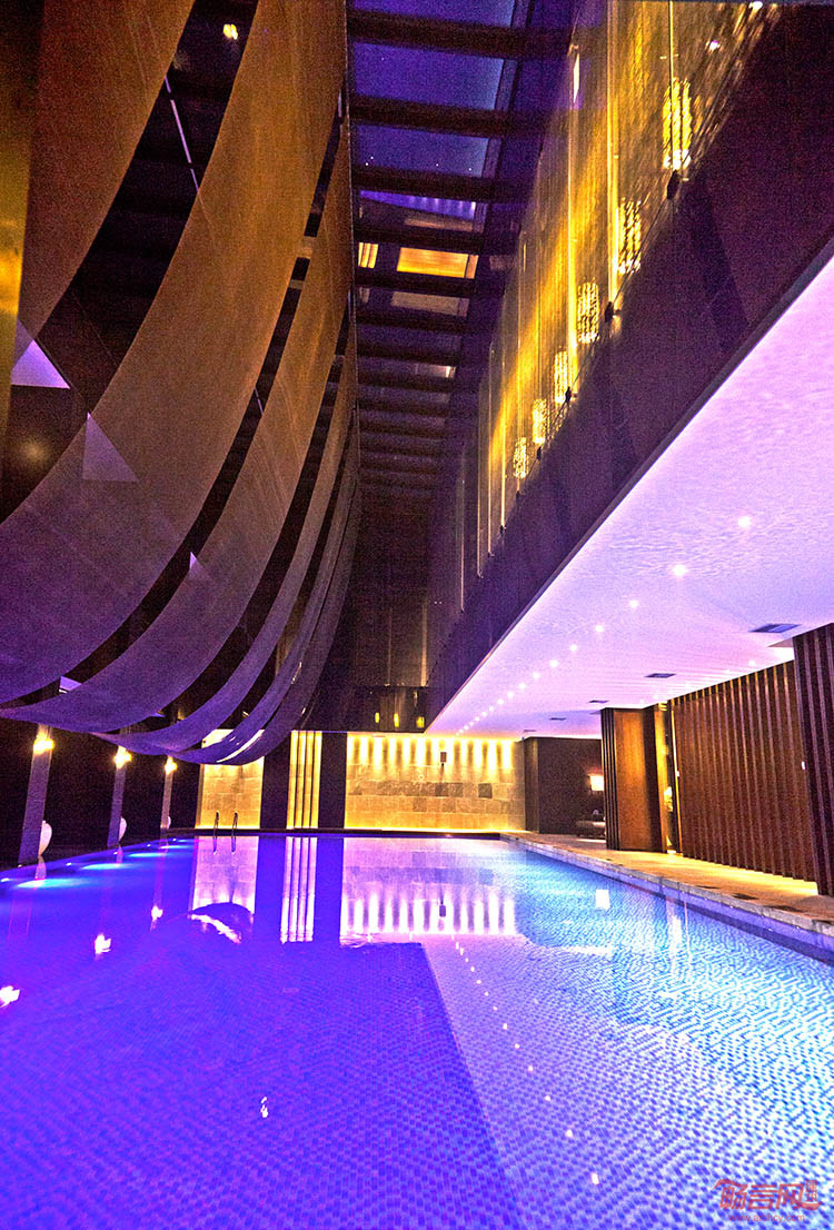 酒店的泳池在建筑的最顶层,玻璃幕墙一侧采用了漫水式设计,置身泳池可随意欣赏园区内的美景,也可透过采光顶棚一览漫天的星光。开放式健身房与泳池相对,健身、小憩、美景,一切设计都为了每次愉悦的健身而准备。