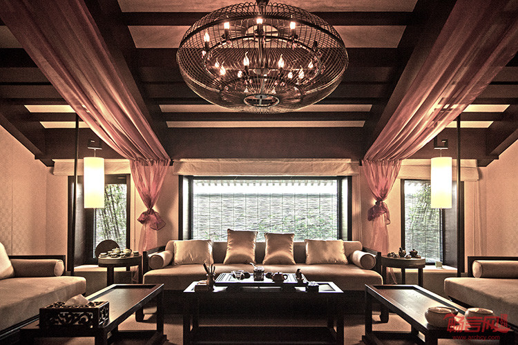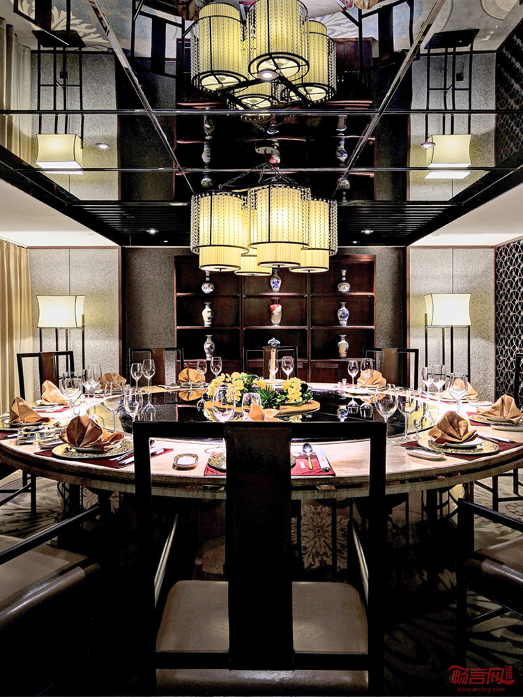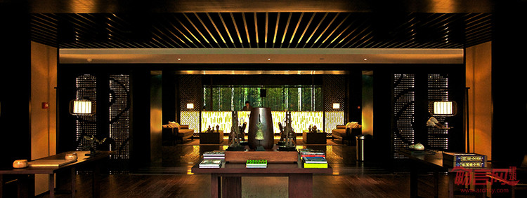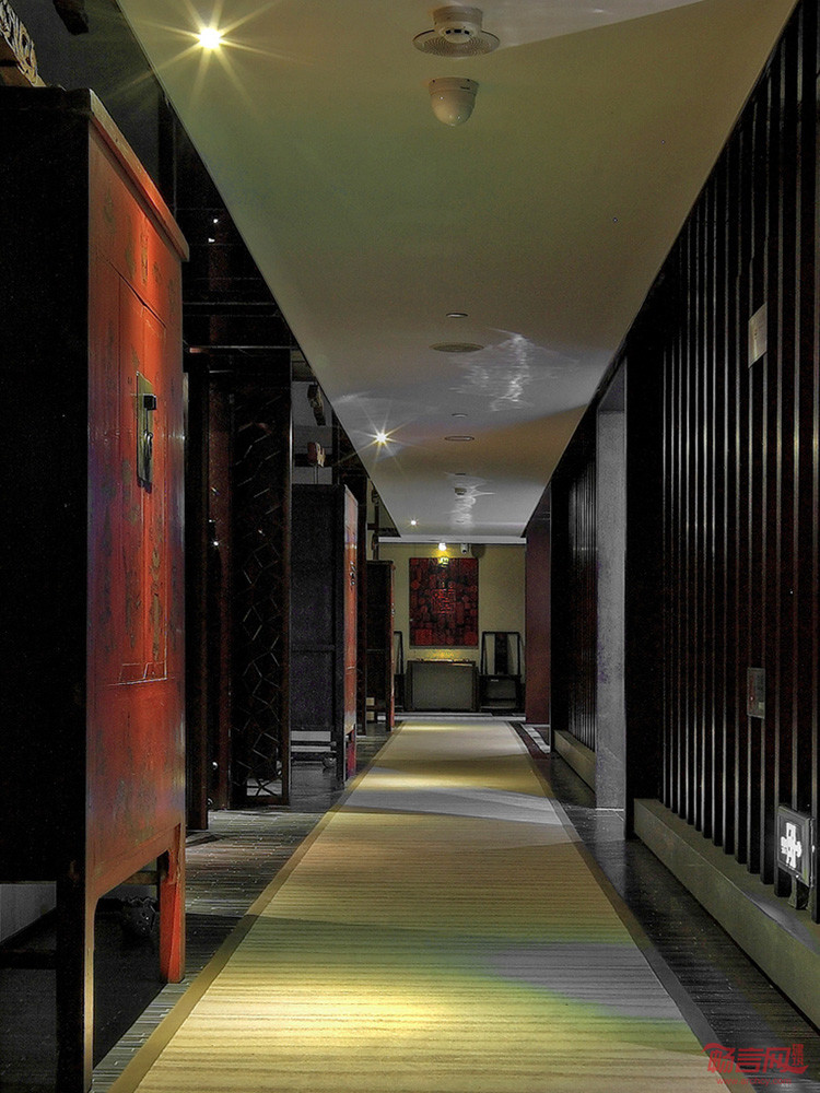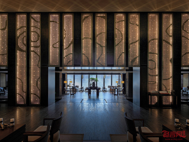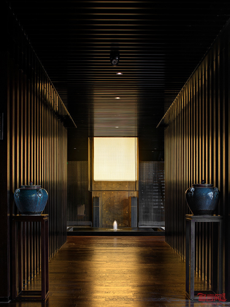 大堂以整面铜板的透光祥云图案墙彰显紫气东来的主题,21米的超长琉璃前台,由室外延续至室内的老北京鱼盆,潺潺的流水、碧绿的莲叶、悠闲的鱼儿,低调奢华的空间中蕴含着丝丝哲意。