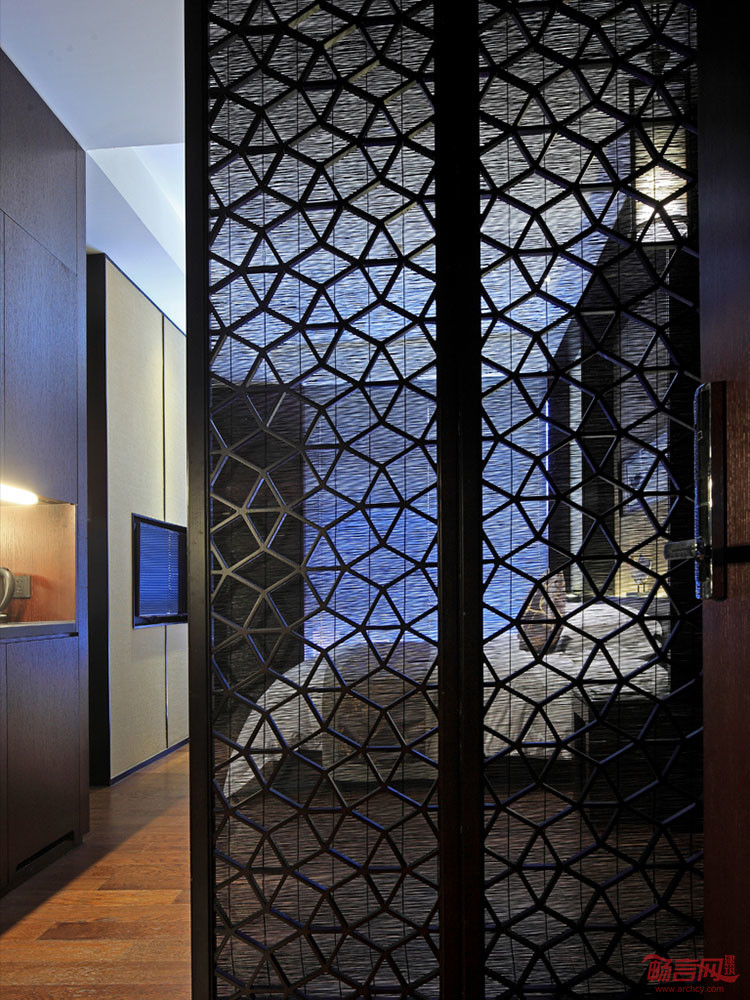 入口引道两侧以圆中有方的屏风为序列,玄关拆除原有楼板后,挑高两层,以《道德经》为内容,以活字印刷术为载体的对景墙,瞬时将客人的思绪引入到老子的“哲思”世界。