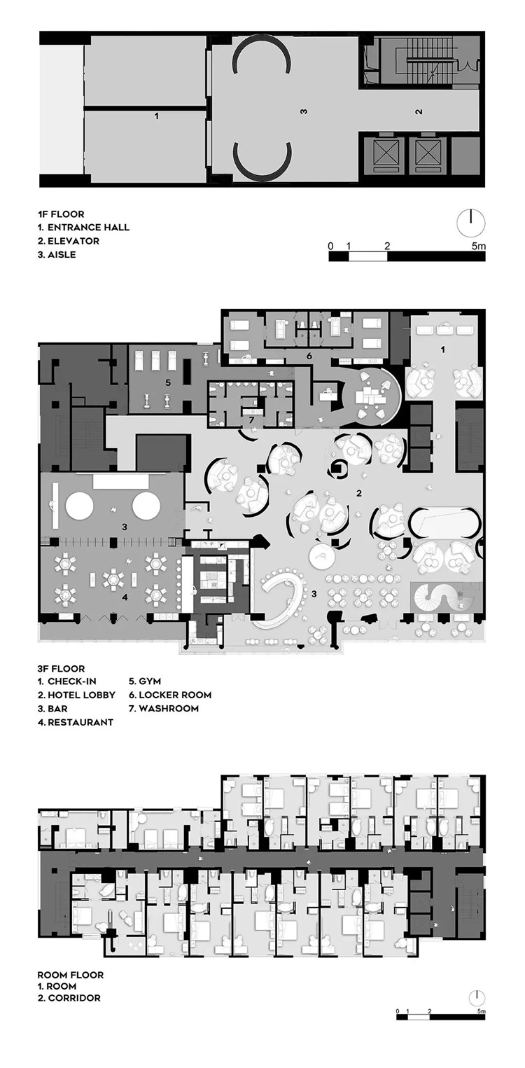 酒店三层,整合了酒吧、餐厅、接待、健身、休闲等多元功能,通过动线的梳理,形成互不干扰的空间格局,而不同空间中以材质的切换,制造不同的空间体验,砖墙的元素以不同的形式贯穿始终,串联起空间的记忆。