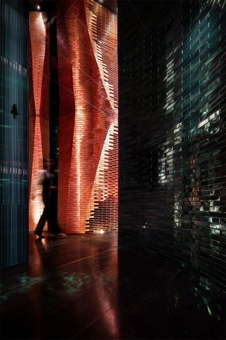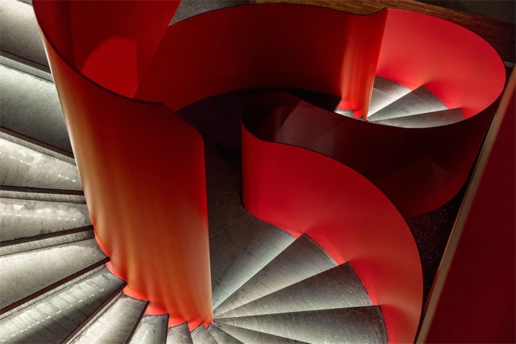 除了流动的砖墙,室内空间中大量使用灯光的变幻和丝绒元素,设计通过视觉线索和颜色来营造持续运动感。一侧的旋转楼梯采用红色烤漆钢板扭旋而上,极具冲击的色彩与形态,让旋转楼梯如同雕塑般,以一种不容忽视的方式,呈现于眼前。