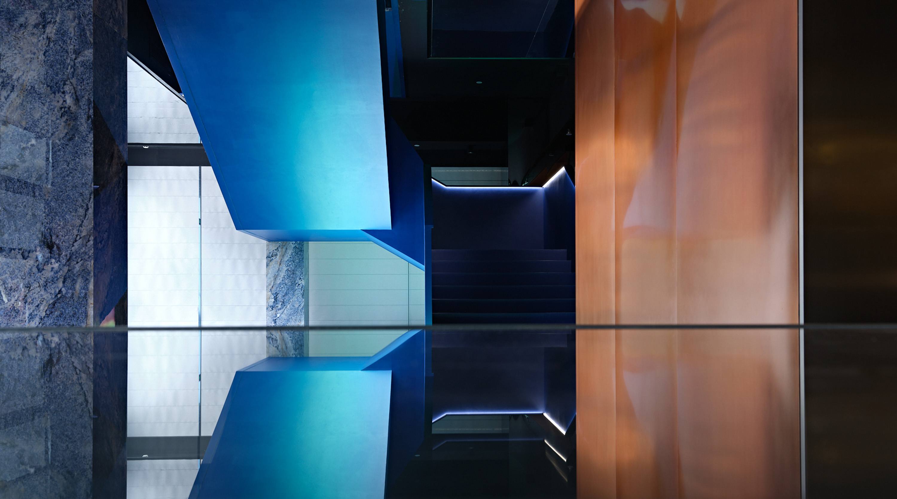 蓝色元素一直延续到了二楼的酒吧和公共区域。二楼区域运用大量镜面元素,通过镜面反射将空间延伸至无限。