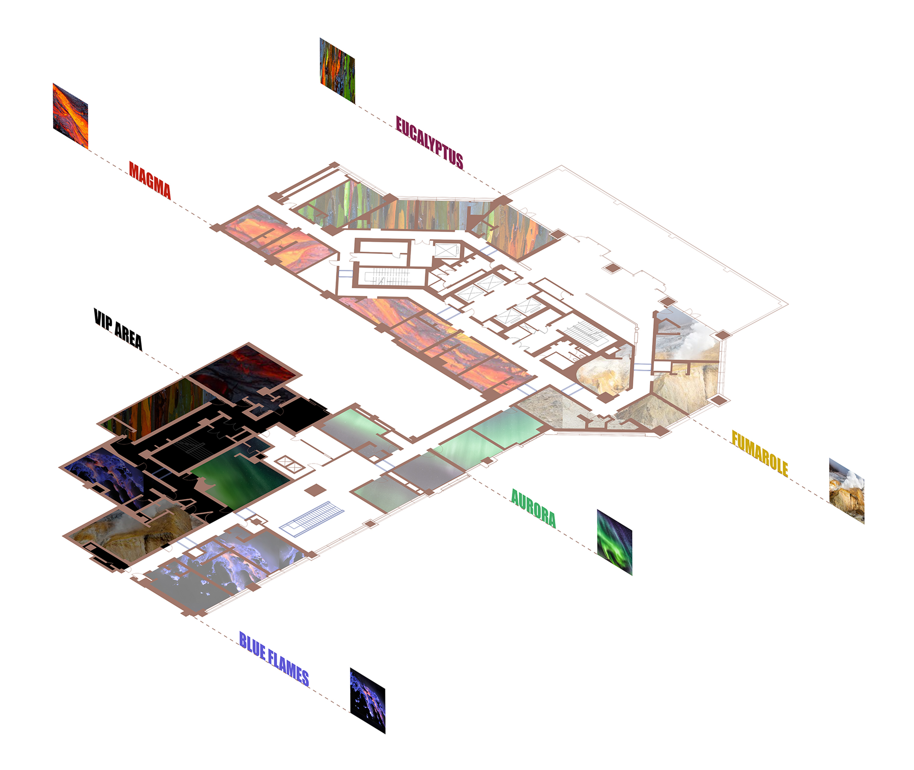从最寒冷的“极光”开始体验,以半透明的大理石和亚光拉丝处理的金属等硬质材料,配合光影,营造了一个绚丽的极光环境。“彩虹桉树”使用各种混合的色彩,同时保留自然元素,沉浸式感受热带雨林的旖旎风光。“火山”使用了强调纹理和触感的材质时,“蓝焰”则保持低调,但通过幽静的深蓝色材质表现出灿烂而遗世独立的感觉。