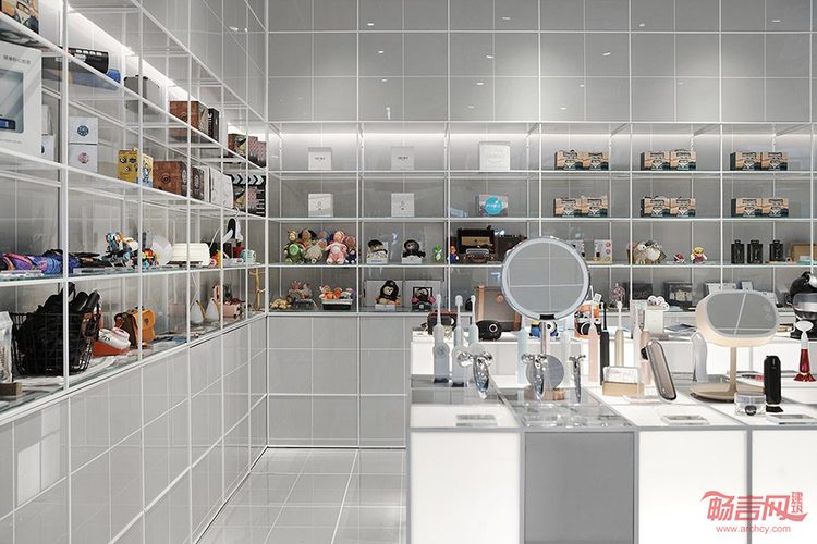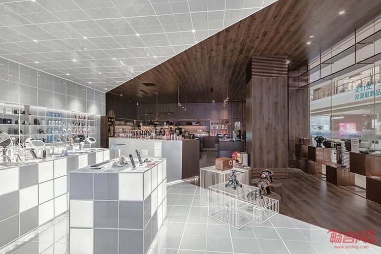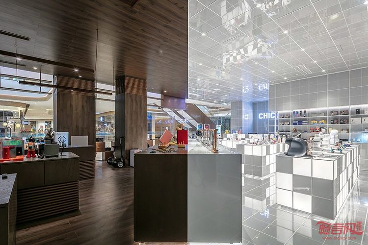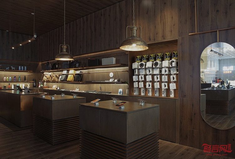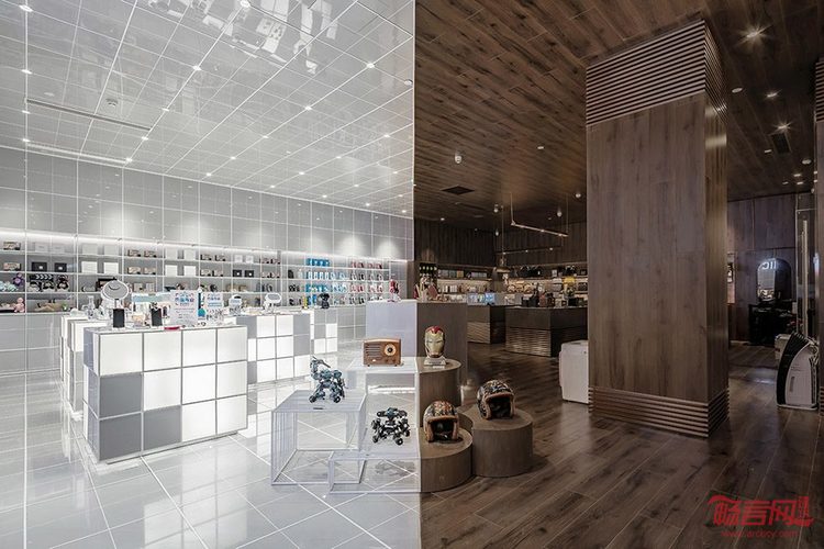 以一条从地面延伸到天花板的无形分割墙为界,两侧空间的差异为顾客提供了“虚拟”与“现实”截然不同的空间体验。明暗分明的两侧空间是针对不同性质产品打造而成的,一边摆酷酷的、年轻化的高科技产品,一边放潮潮的、生活化的传统产品。明亮的“虚拟空间”与深色的“现实空间”之间,虽形式不一而泾渭分明,但其展柜布置与空间材质的统一规划加强了整个设计的完整性。