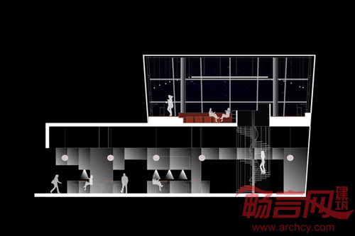 整个空间共分为两层。我们去除了一层空间的玻璃外墙,并以卷帘代替。通过这种处理手段将一层打开,成为公共开放空间。第一层分为两个区域:快饮区和休闲区。在快饮区内,我们精心挑选了高脚桌和高脚椅,并将它们放置离操作室较近的位置。操作室的外墙石材由白玻璃围成。休闲区的长椅紧贴墙体,与之呼应的是钢制的图像展示台,投影仪和镜子。第二层的特点是圆环。设计主旨彰显吊顶灯的独特风格,营造一处集中、环绕的空间构成。
