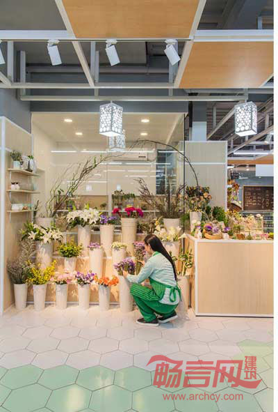 设计语言体现在装饰材料之中:外部和内部空间地面均铺设同色系绿色六角形瓷砖,与不同区域相搭配。超市的天花板由网格状的白色喷漆钢管构成,不同区域安装木饰面天花板,作为屋顶照明系统的总体构架。