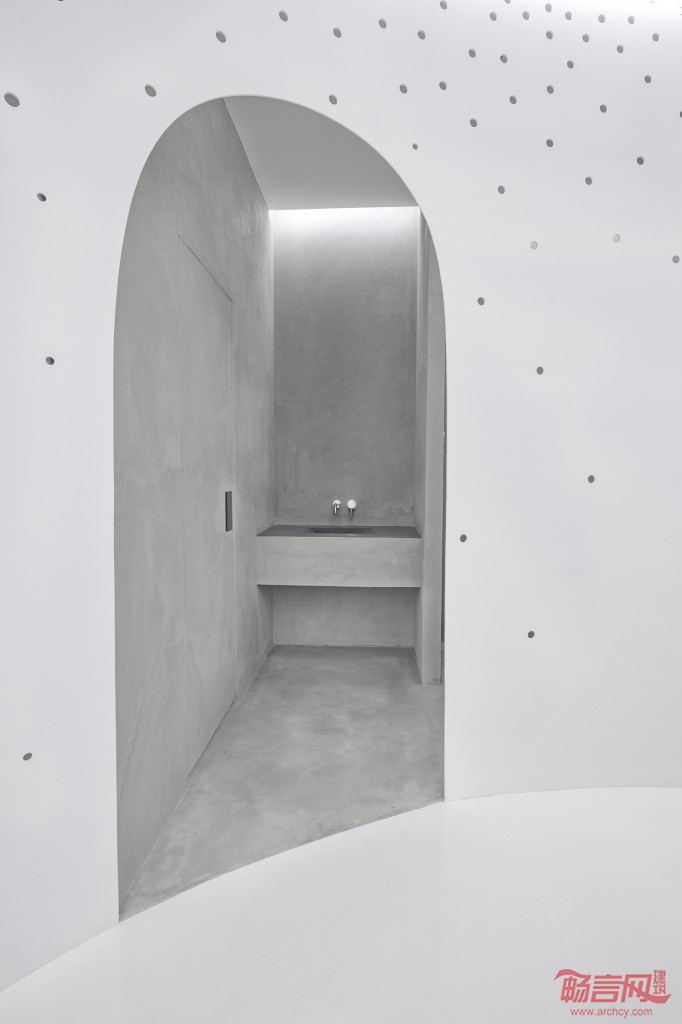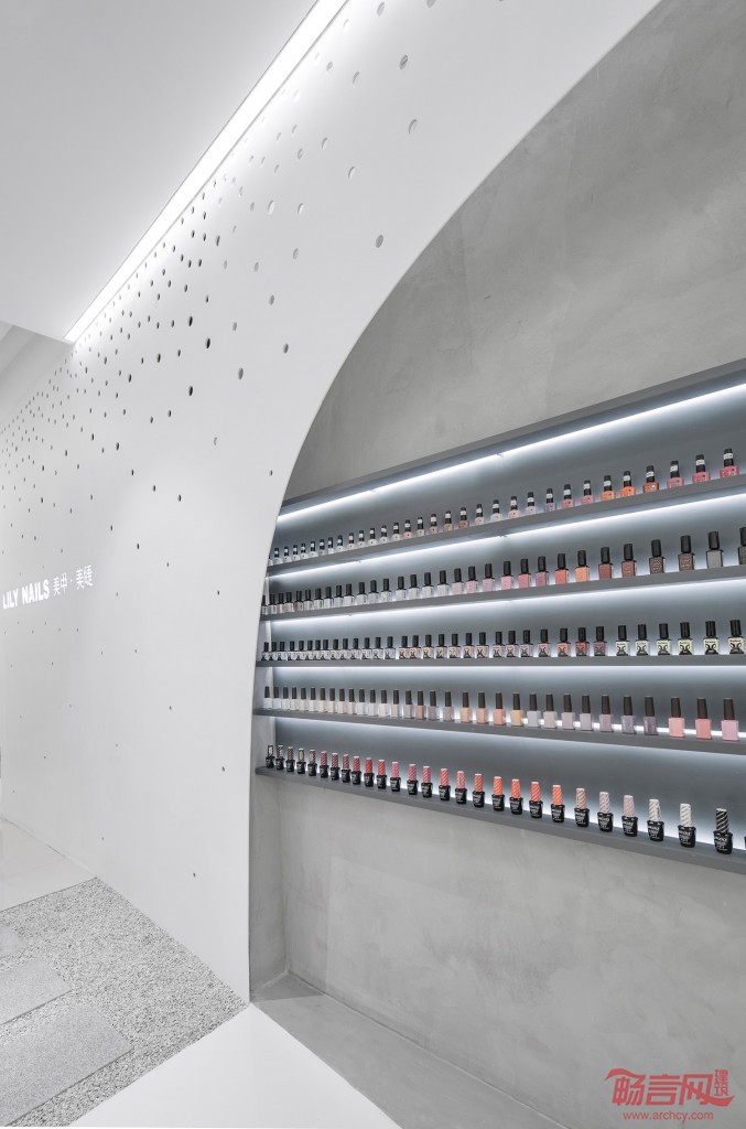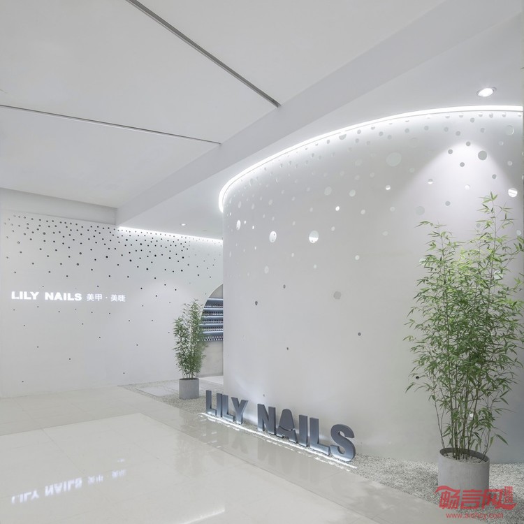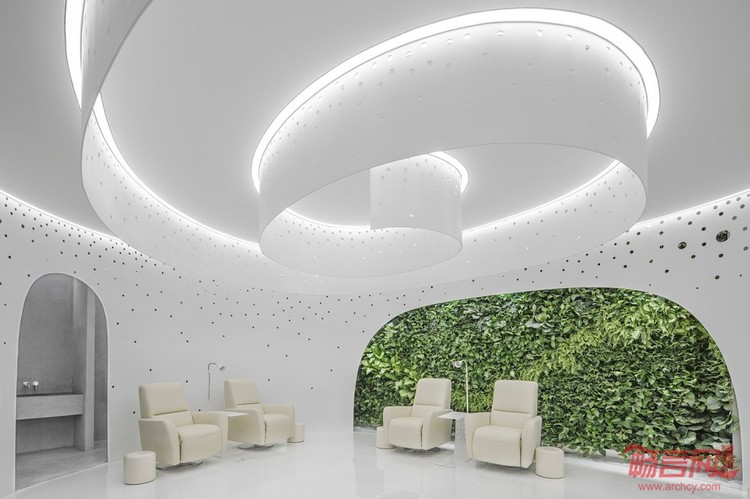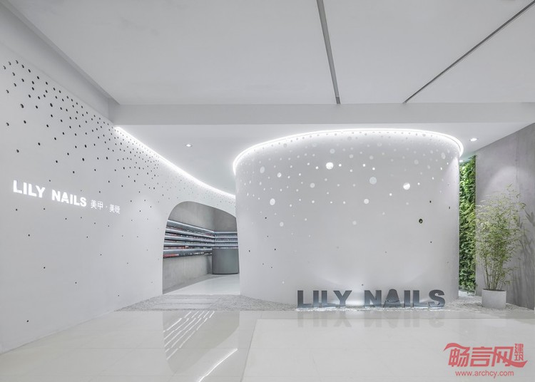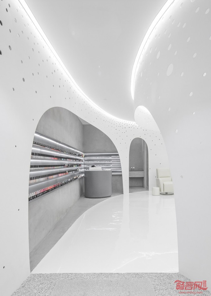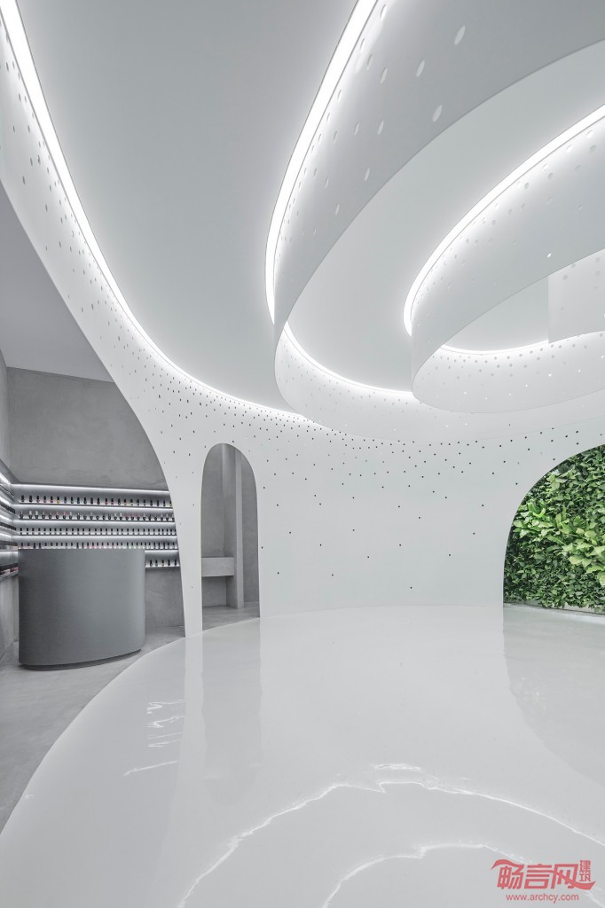 设计摒弃了以往该类型店铺所采用的过度装饰的符号化做法,以营造轻松、舒适、自然的环境体验作为出发点,让顾客们在这里可以放松身心,仿佛置身于一座花园。一圈儿8毫米厚的白色穿孔钢板从商场走廊逐渐延伸至店铺内部,创造出一个柔软、纯净的弧型空间。不同于以往美甲店排座的方式,这里的六个座位是向心排布的,顾客在美甲的同时也可以愉快的交流。LED发光灯膜结合螺旋钢板,营造出柔和均匀的室内光环境。植物墙作为整个空间的绿色背景,使新空间富于生机。螺旋曲线与原有方形店铺的空隙自然形成了前台展示、植物景观和员工服务等辅助空间。