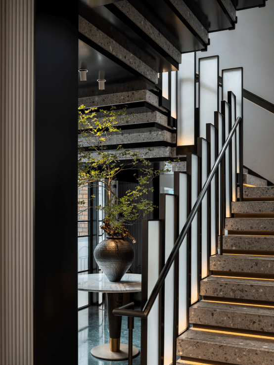 设计师在空间中心区域为大型绿植留出位置,各个角度看去,皆是枝横叶蔓的景致,是中式文人雅趣,亦是对自然的敬意。
