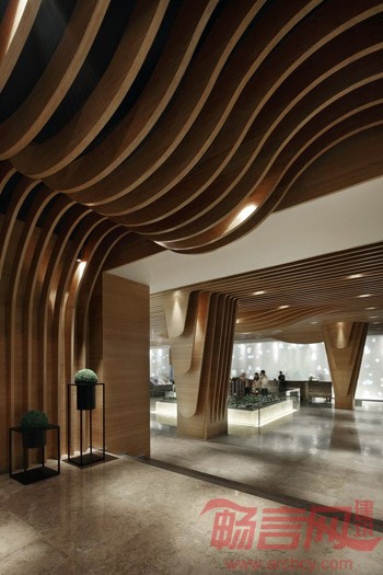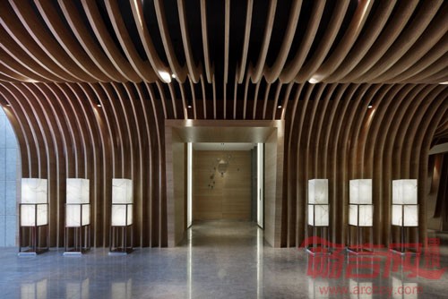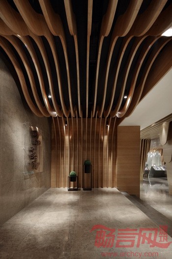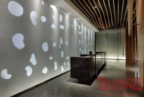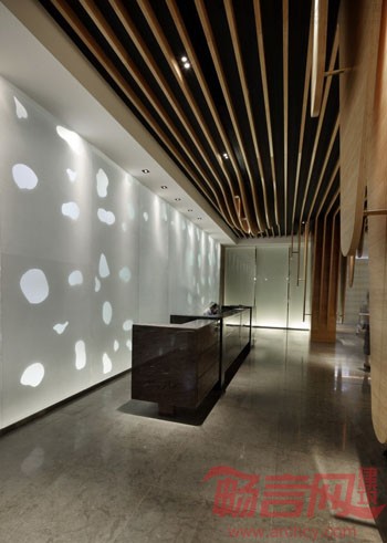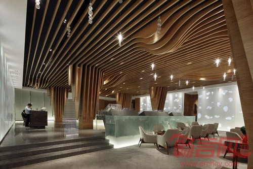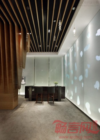 由此出发,设计师以自然的竹木色和清新的湖水绿铺满整个空间。天花密密的竹木条在垂直方向弯曲成流水一般的柔美动态,犹如溶洞中即将滴落的石钟乳,在自然重力的作用下垂到了地上,巧妙而又自然地隐藏起原建筑结构中六根粗大的柱子。服务台水绿色磨砂玻璃的背景上呈现出数不清的水滴形状,从木条天花上垂下来的水泡灯,像滴落的水珠被定格在半空中,晶莹闪烁,带给人唯美的视觉感受。
