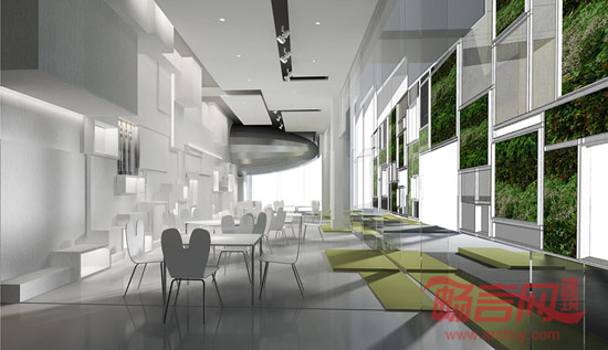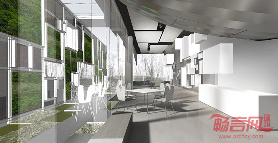 本案是为华通建筑公司设计的一个小型展示厅和会议空间。它位于建筑首层,与入口大堂相连接。尺寸为24米长6米宽、6米高,是个中型空间和休息区。我们利用户外来扩大室内空间。它面朝南,户外绿色挡墙可起到隔离光照的作用,同时挡墙本身也是个竖向花园。
