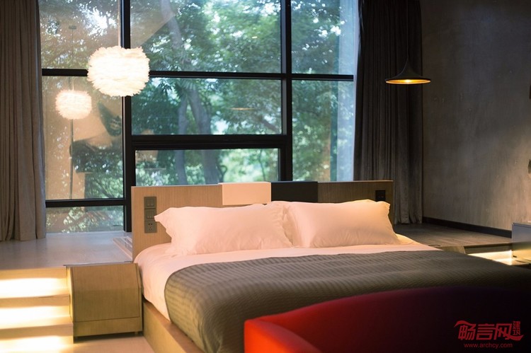 相较于前半部分的压抑,客房的后半部分略显宽敞,以保证用户在睡眠的舒适性。迷你吧紧贴床体,让食色二性相互促进。加宽的床靠、升起的床架不同于普通的床体,意在激发出不普通的情侣活动。