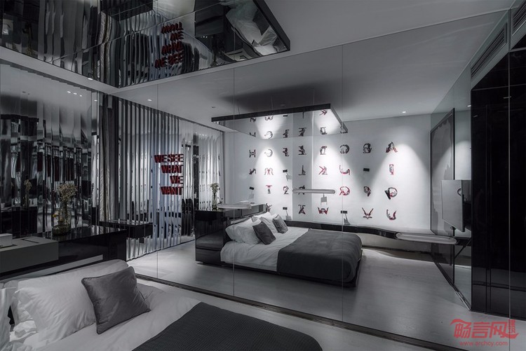 而不同维度上的镜面叠加在无限满足人们对自我迷恋的基础上,在感官上放大了空间各方向的尺度,从而改变了使用者的空间感受。吧台、书桌和作为传统重点的床结合成一个组合家具,床背就是可供用户对饮小酌的吧台,又可做书桌使用,将情侣行为的各个阶段通过设计更紧密地结合。