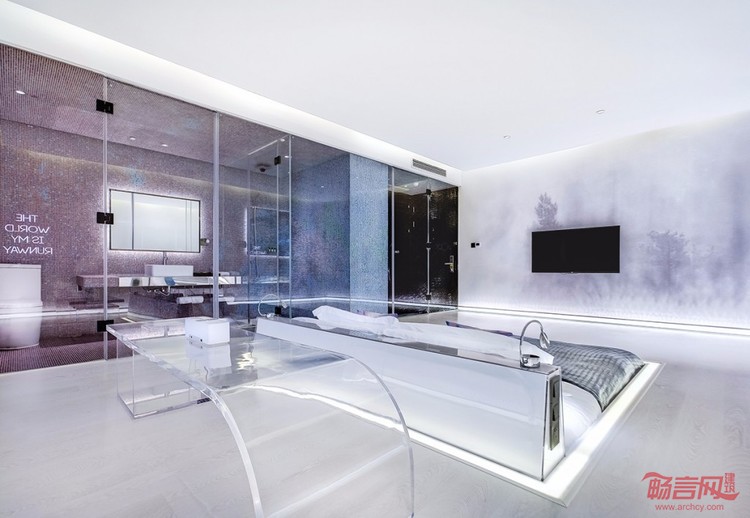 在经历狭长走道的压抑后,用户可以在由舞台、沙发及床形成的活动序列中释放自我。而作为序列终点的浴缸则设置于房间尽头的落地窗边,通过引入的窗外景色,激发人们在自然中最为本源的欲望。