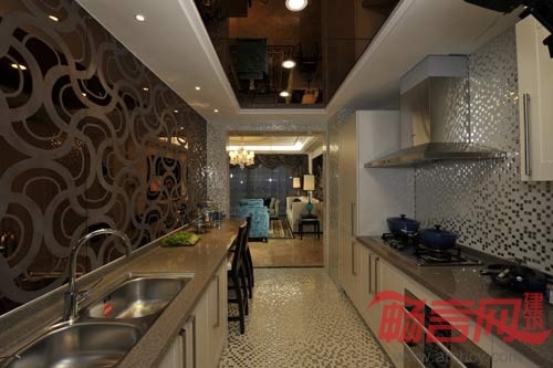 厨房空间以图案镜面作为装饰主墙,使早餐台也多了几分趣味性