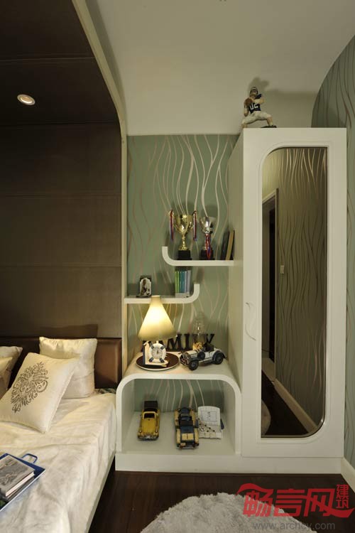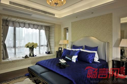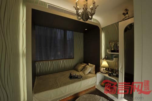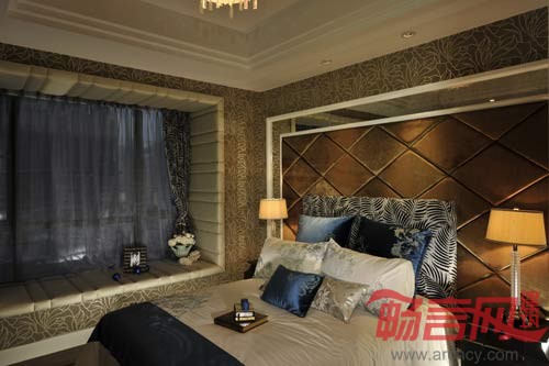 主人房的飘窗设计师完美的利用作休闲与观光区,用软包高贵材质与灯光彩夺目来塑造更稳重、浪漫的环境,诗人亲感到自身的高贵地位。