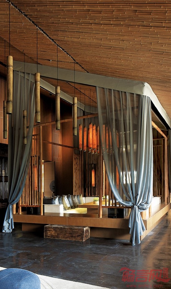 最末端的小竹亭掩映在一层自天而下的半透明纱幔里,它有着个直白的名字——发呆亭。顾名思义,在这里唯一需要做的事就是发呆而已一一偶尔发发呆放放空、远离都市的尘嚣和烦忧,真应了一沙一世界,一花一天堂。在禅意的角落里,人们能够忘记生活的烦燥,在静谧中“诗意地栖居”。