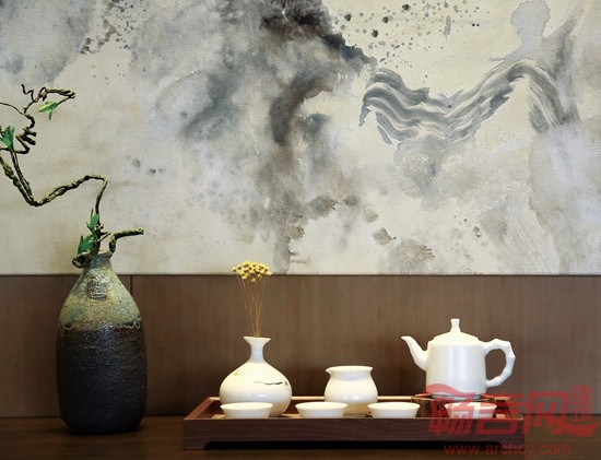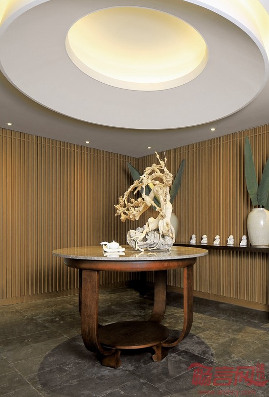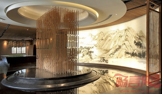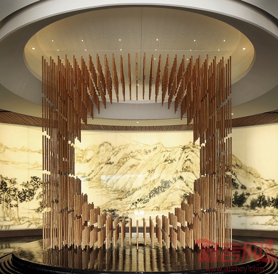 入口处主题艺术装置为该空间设计的精神堡垒,天然竹节通过透明鱼线串联组合成了一个“天圆地方”,透过中心孔洞,后面是一幅由天然材质拼贴而成的、气势磅礴的巨幅水墨山水画,在底下薄薄一汪清泉缓缓涌动下如梦如幻;清风过处,水波浮动,连同联接天地的管竹相互共鸣……在这静谧的氛围中,仿佛置身于那山、那水、那片竹林之间,“禅”便是在此了。