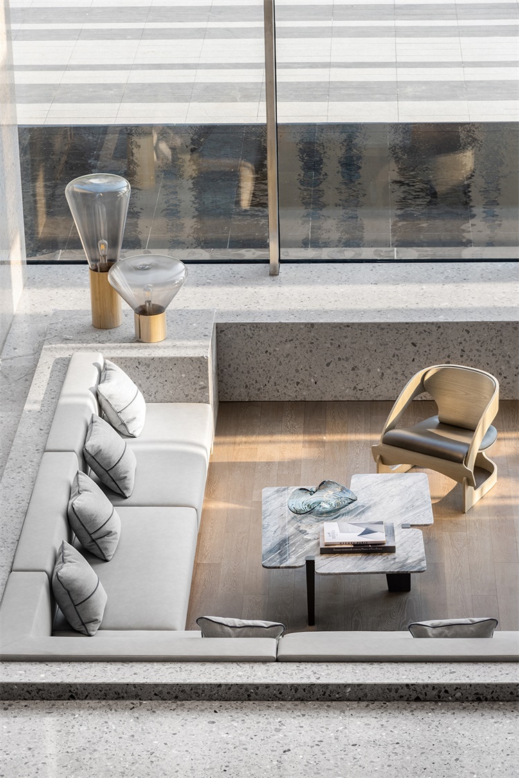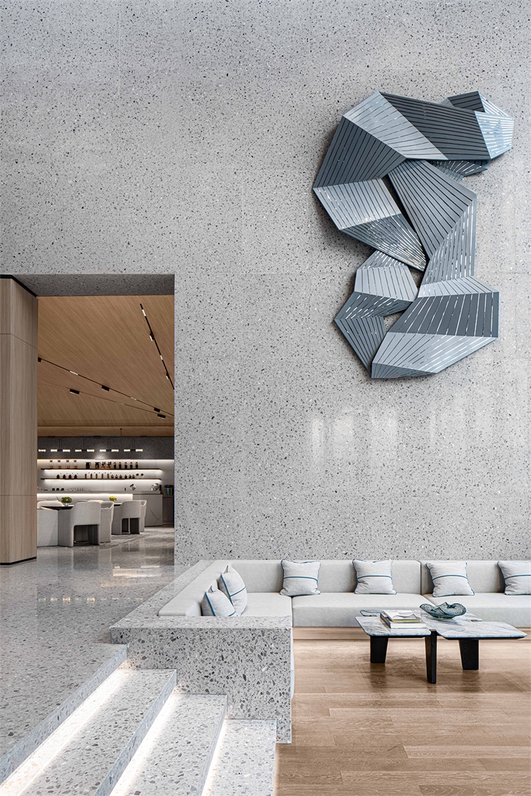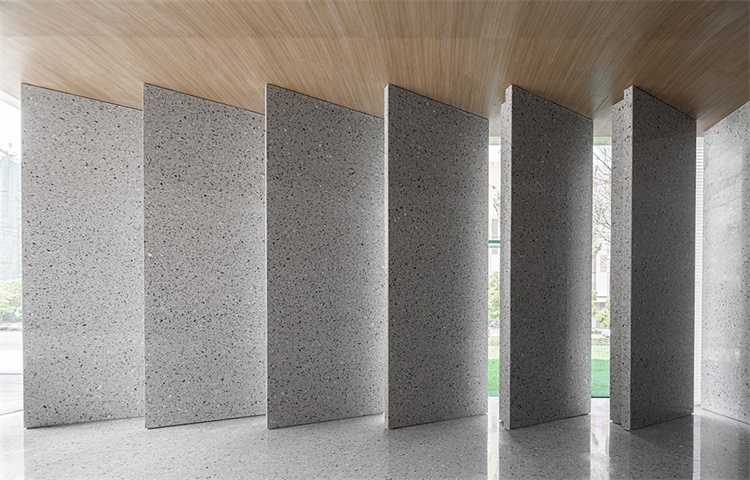 设计师使用水磨石制成独立体块,创造跳脱的动态视觉效果。通过体块之间的间隔引入自然光,光线本身赋予了水磨石色彩的渐变,突出了形体光影和虚实的变化。