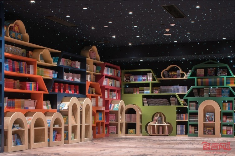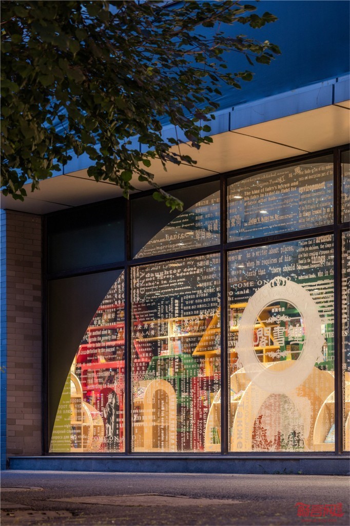 在这间书房的正对面就是儿童绘本馆,为了能够体现孩子天真烂漫的天性,我们把书架做成了可拆解移动的玩具形式。墙上的书架底部部分都可以自由从墙上分离出来并同时兼顾摆书台的功能,当需要场地活动时,它们又可以移回墙面归位到书架里,合成一个城市的街景图案,并融入了扬州的街景文化,通过五彩缤纷的颜色来活跃整个空间。使得儿童一旦进入这个空间,就像来到了一个卡通版的扬州城市一般。从童书馆的一个拐角探出,就会到达一个小巧精致的玩具馆,整齐陈列着成人与儿童的各种学习用具。这就是丰富多采并秉承着扬州文化故事的扬州钟书阁!