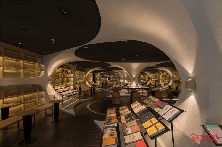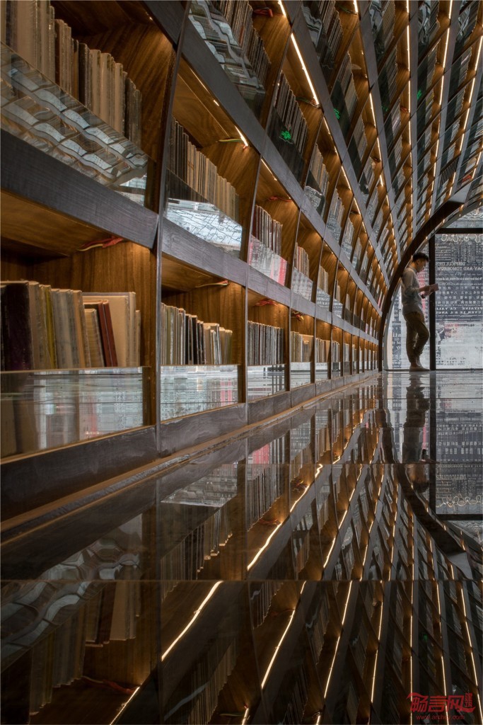走入扬州钟书阁的正门是书店的前厅通廊,设计师利用拱桥的概念延续了钟书阁书天书地的视觉符号,地面与天空中的河流铿锵前行引领者读者深入更加浩瀚的知识海洋。两厢的书架用优美的弧线结构拉伸天际线的形状,宛如溪流之上的桥梁,搭建着人与书籍之间的那座心灵桥梁。进而向前在右侧则是更加广阔的书籍之地,设计师通过研究拱桥及河流的关系,从而得到了一个上下镜像的空间关系,利用各种拱形来连接各个区域,让每一位读者进入这个空间的时候能够充分的感受到在这空间带来的震撼力,加上温和的灯光所带来的神秘感,会让读者不由自主的想起桥下的波光粼粼,使人能够心情平和地享受读书的快乐。由波澜起伏连接而成的空间更保留了足够的尺度,作为读书分享会时读者坐在一起分享的场地。