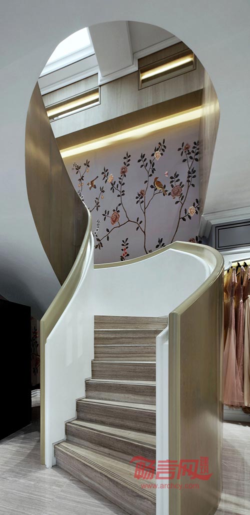 楼梯曼妙的曲线和雅致的色调蕴含着优雅的气质,风华雅丽的花鸟墙纸平添几分娇俏与轻盈。