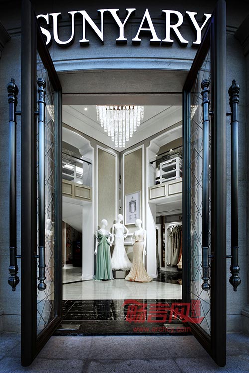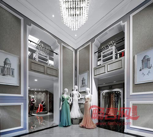 精细考究的欧式廊柱与室内风格保持一致,典雅的灰梨木烘托出高贵的展示气氛,精致灯光下,奢华定制的礼服风采熠熠生辉。