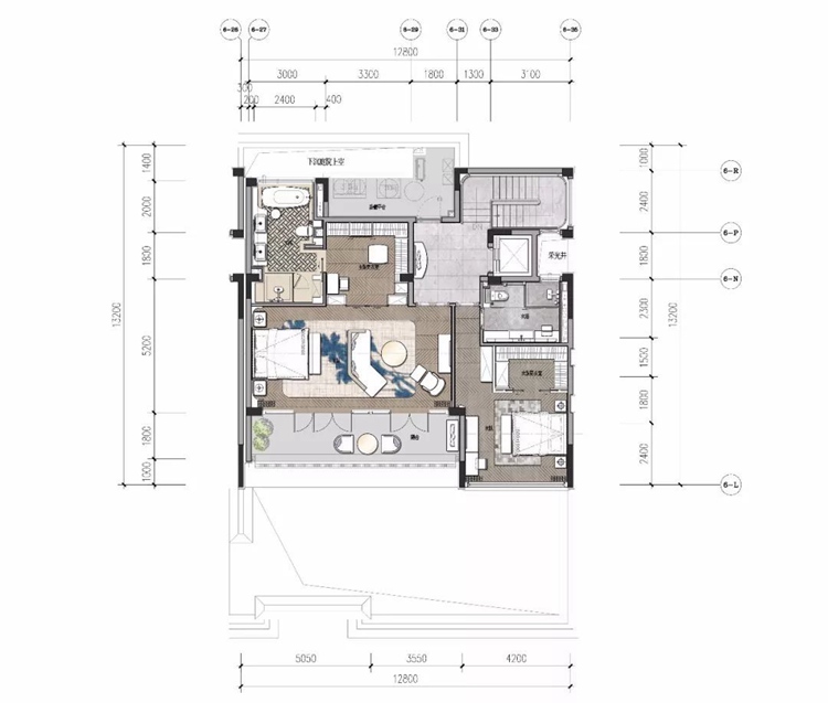 一层客餐厅地坪拼花设计概念源自青石板路;整体空间灰、白色调源自白墙黛瓦;而软装的黄、蓝色调点睛之作则来自江南的春天色彩,记忆中的江南蓝花布,将江南水乡自然、人文之美带进居室生活中。