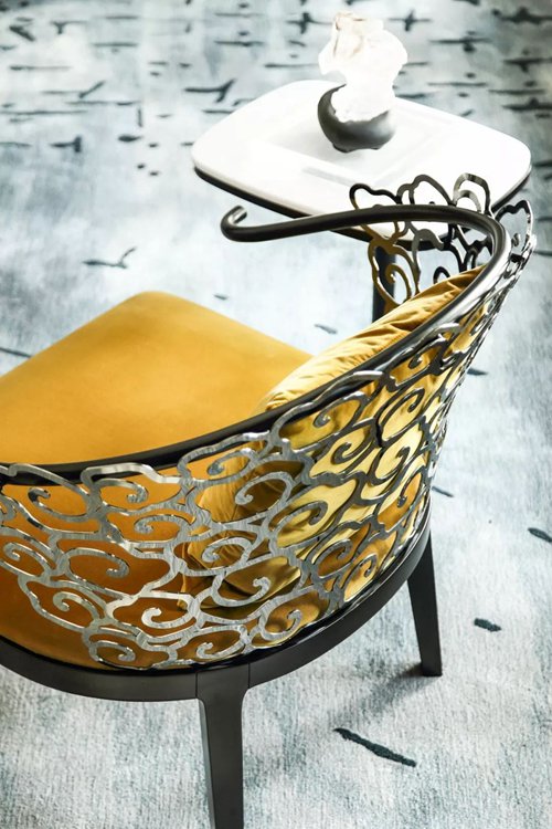 会客厅巧妙地连结吧台区与书房品茗区,每个空间看似独立却又相互串联。这是设计师的“刻意为之”:“中西生活方式合并,看似彼此矛盾,却也产生恰到好处的融合之美。独立使用的时候可以保证功能分区,但当他们合并在一起,生活也就有了重叠。”