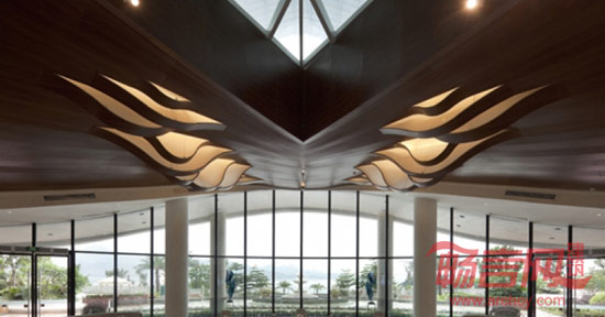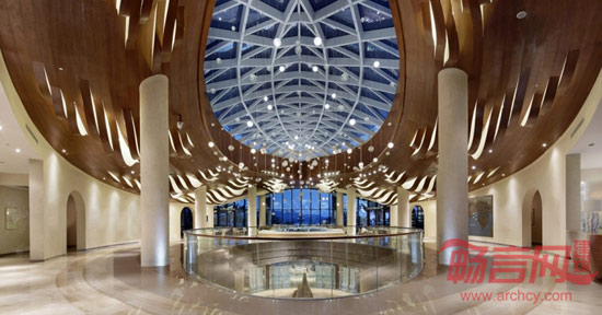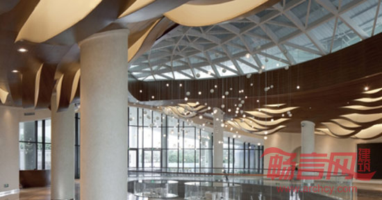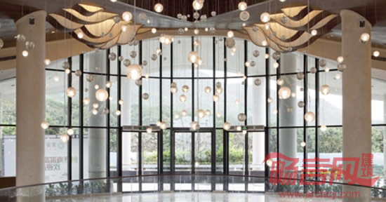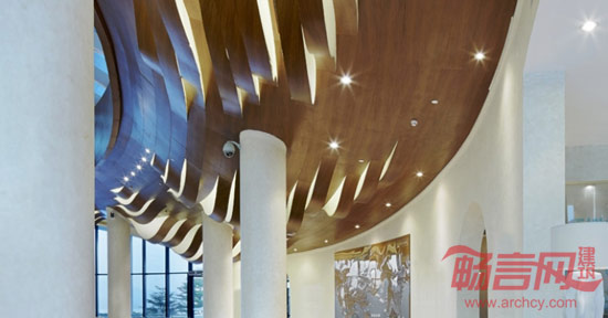 设计形塑了一个大隐于市之空间场域,供喧哗城市生长美好的风景,旨在提供一种未来生活空间的雏形。应用现代简洁的设计语汇,营造急剧张力的空间感受,用强感召力引领宾客步入室内。波浪起伏的木铝板天花造型,水波纹的大理石地面铺装,极具地域特色白色拱形门,自然形态的叶子玻璃天窗造型,与天窗下洒落的漫天气泡灯构成室内空间与建筑结构的微妙结合,并化作建筑景观的延伸。