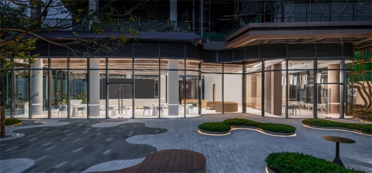 细雨鱼儿出,微风燕子斜。——川渝地区多雨,取雨滴打入水中激起的朵朵涟漪作为灵感,配合展示台,地面采用环形金属条作为分割,用白色石材与水磨石搭配出一场春日中的细雨微风。