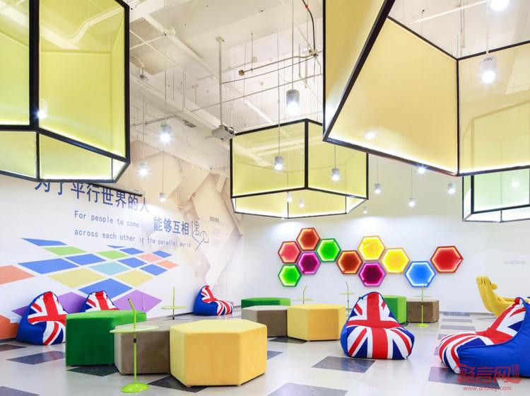 设计秉承造价低,工期短的方针,以及地下环境条件,在设计中地面沿用原建筑条件,减少资源浪费;墙面使用白色乳胶漆,保证空间的明亮度;隔断多使用半磨砂的透明玻璃,增强空间通透感及光环境的互补关系;而顶面六边形造型选用更有质感、便于后期维护和具有通透性质的材料——着色纱布,与部分彩色墙贴配合,丰富空间美感的同时保证光的发散条件。