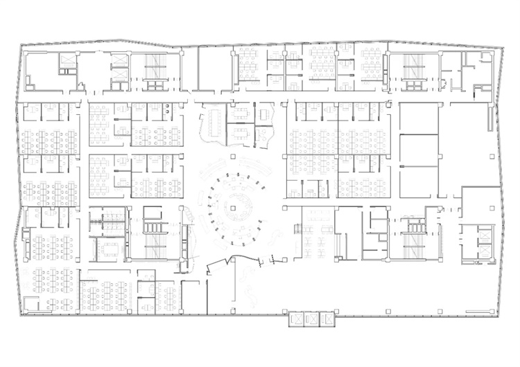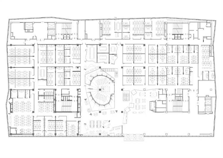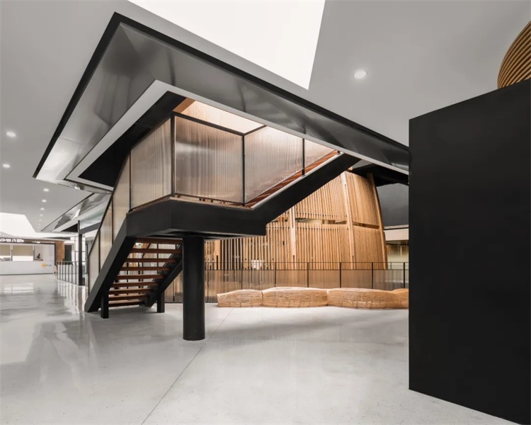 空间布局围绕中庭路演区展开,将共享功能模块布置在建筑几何中心使得空间配比相对均衡。通过增设联通各层和屋顶花园的楼梯,打破各层界限,增强空间的关联性。采光天窗增加了阳光的射入,使得进深过大的室内每个角落都可以有自然光,给办公者营造了良好的氛围。