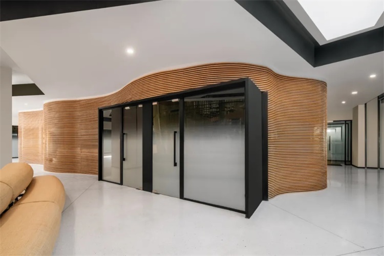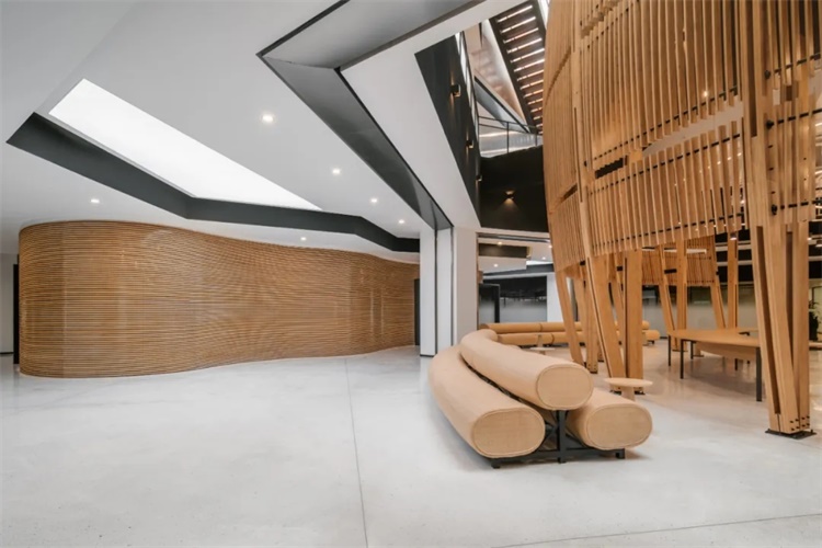 空间形态来源于云南本地竹楼结构及梯田形态,通过竹制材料的介入并融合云南传统竹编工艺强化本地特色。竹材的柔性,使得建筑内部空间的灵活性更强,整个色彩也使得室内更加柔和、舒适,营造了良好的办公与休闲环境。