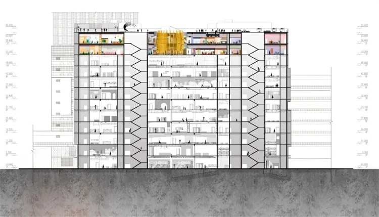 项目位于整幢大楼的最顶层,我们将这两层以及屋顶作为一个整体来设计,并且在最中心植入一个空中的竹楼,在建筑中营造出一个巨大的围合空间,消解了建筑中矩形柱网的均质感。竹楼是云南地区傣家的标志民居,我们将此元素在公共区域延伸,结合地域性的材料,让整个设计能够为人们传达出城市的个性与特征。