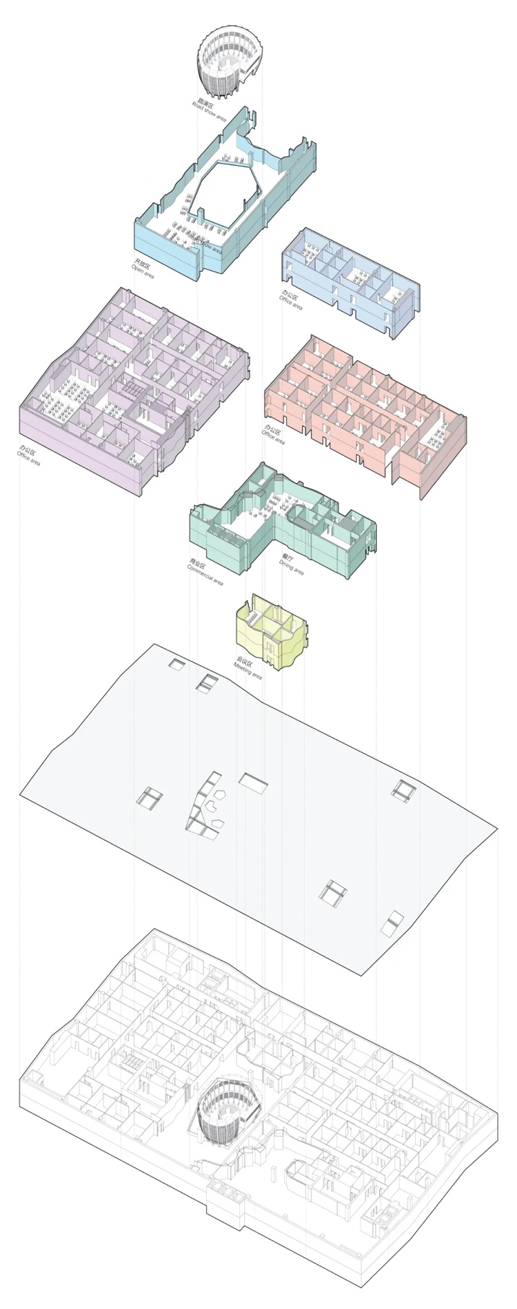 云南特有的自然条件,在这里形成了许多极具特色的梯田与竹楼,附近的村落分布在梯田四周,形成一种聚合式的布局。我们将这些元素与联合办公中现代社区的功能结合,形成了一个围绕着中间共享空间布局,四周有各种功能环绕的基于地域性的空间布局模式。同时,联合办公的功能也营造了一种社区化的办公模式,打破了传统写字楼对人造成的消极固化的影响。