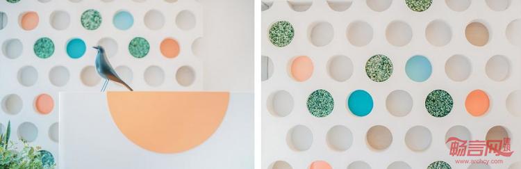 齿科坐落于一个创意园区内。从行为角度分析,看病不同于购物,几乎没有偶然性的客人,患者均是了解诊所之后才选择前往。特殊的行业属性使得该空间并不需要为了招揽顾客而使用醒目的店招,一个友好的外立面能淡化医疗空间和患者之间的距离感。因此,RIGI采取了弱化室内室外界限的设计策略,在外立面上通过植物将室内外的空间联系,并尽量精简logo在墙上的尺度,不传递出过分的商业气氛。外立面通过代表平拍IP的圆形元素延伸到室内空间,并应用趣味性的材质表达,营造温暖的商业空间氛围,而前台区域也尽量传递的轻松,平等的态度。至少从入口开始,这就是一个友好的空间,一个温暖的诊室。