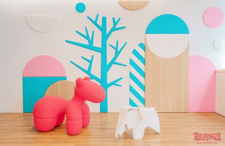 齿科的品牌logo及IP形象为橙子,所以RIGI将圆形作为基础元素贯穿整个设计当中,木质材料与选择性色彩的搭配在感官调性上传递温暖的质感。整个空间布局由入口区,儿童区,等候区及就诊区四个模块组成,每一个模块在空间中的作用除了基本的功能之外都有相应的设计洞见,而这四个模块组成了该齿科品牌空间的基因,让冰冷的医疗功能空间转化成与人有关的传递温暖与关怀的生活终端。