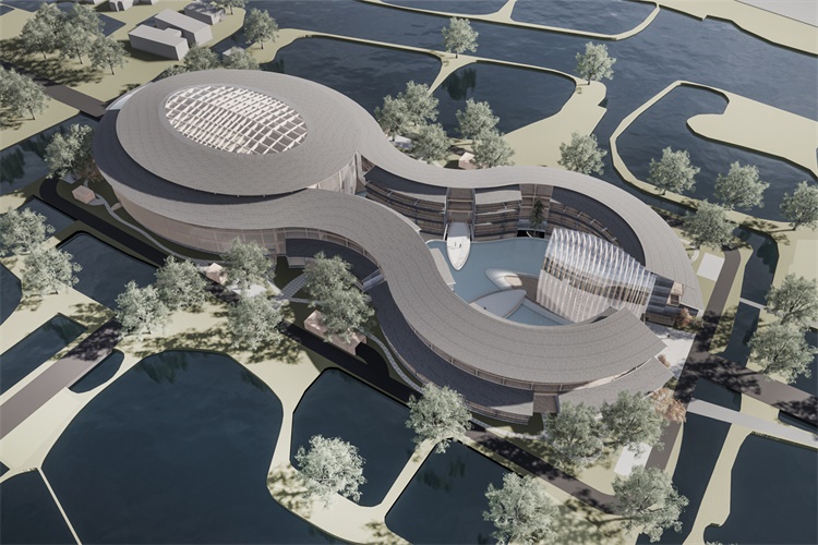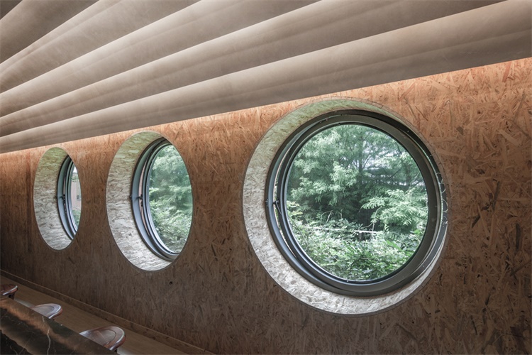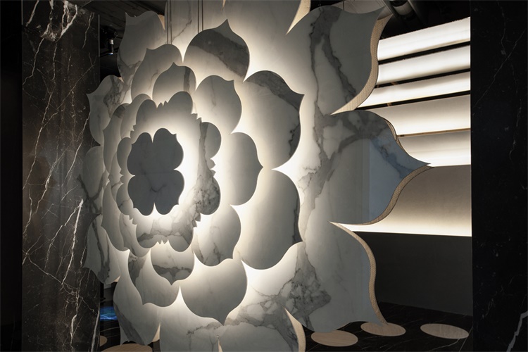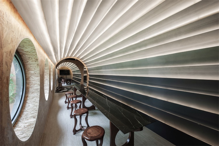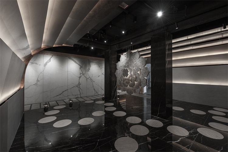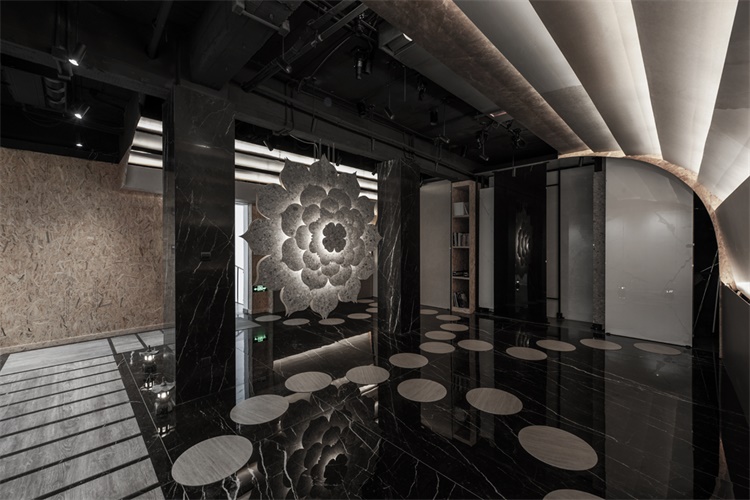有别于传统展厅的呈现方式,我们以一个文化的符号植入空间当中,原本以纯粹功能性为导向的空间产生了一些戏剧性的变化,作为主题的材料也由于这种变化,呈现出更多的可能面貌。在形式,光线和景致的作用下,仪式感的空间和功能结合在一起,通过材料实现了一种截然不同的现实体验。